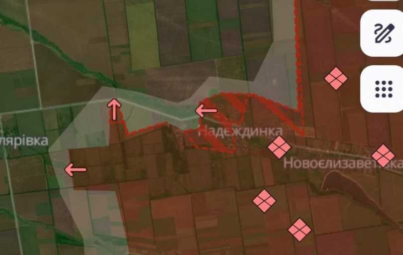 Аналітики також внесли зміни до карти бойових дій. Наразі Надіївка позначена червоним кольором — це означає, що контроль над цим населеним пунктом перейшов до окупантів.